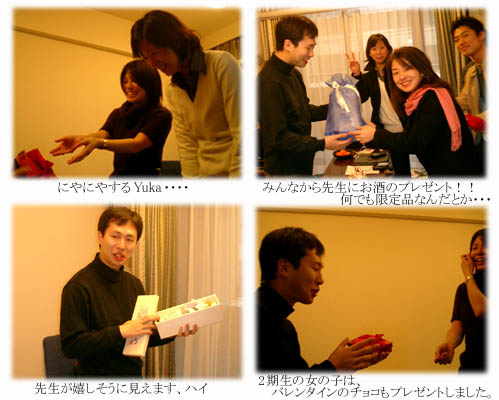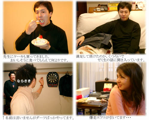 | 2月11日は小野先生の誕生日でした。 この日は、2期生9名で小野先生のお宅に押しかけ(!?)ました。 ケーキとプレゼントを手に、Happy Birthday to youを歌いながらクラッカーを鳴らしたときの小野先生の驚きの顔は忘れがたいものとなりました。 先生のお宅に滞在したのは1時間ほどでしたが色々な話で盛り上がり、藤村さんの暴走(笑)にも拍車がかかりました。 ついに30歳になられた我が師匠にも喜んでいただけたようで、就職活動中の辛い日々のなかで楽しい一日を過ごせました。(神谷) |