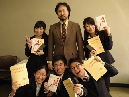商学会賞を狙いはじめてから約10ヶ月後の3月26日、ついに授賞式を迎えた私たち。 本日も晴天なり。 今回、この栄誉ある賞を受賞した学生11組のうち、第8期の中村さん、鈴木さん、そして、第9期の私たち 「十ゼミチーム」(刎本・高木・渡邉) の3組の小野ゼミ生が占めることができました。 |