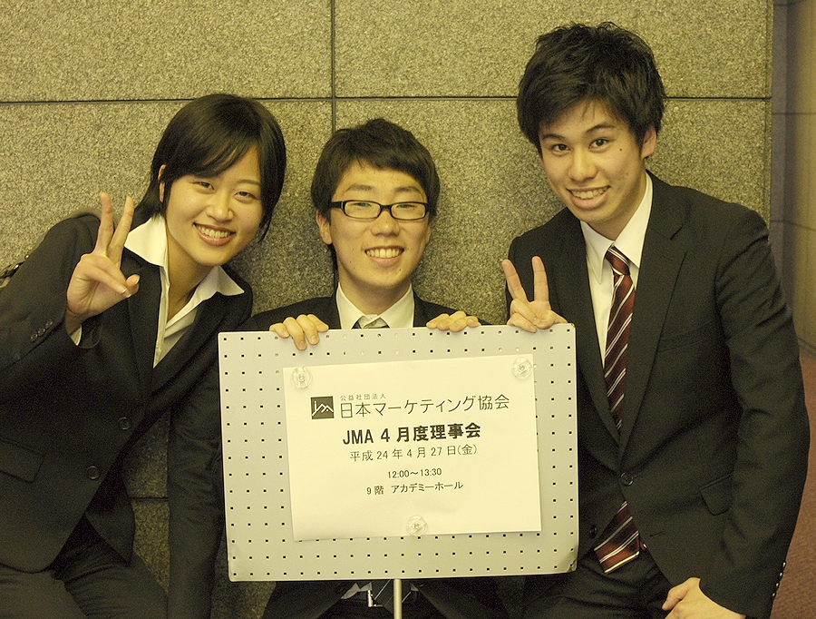 @(社)日本マーケティング協会 9 階 アカデミーホール (〒106-0032 東京都港区六本木3-5-27 六本木山田ビル9F) 思い出はいつの日も雨。 本日4月27日、JMA (公益社団法人日本マーケティング協会) の理事会という晴れ舞台で、われわれ小野ゼミ第9期関東十ゼミ討論会プロジェクトチームは、 昨年度最優秀賞を授賞した研究を発表させていただきました。 約40人の財界トップの方々に対して、3人の学生が偽物製品についての研究を語るというのは、まさに大冒険であったと感じます。 |