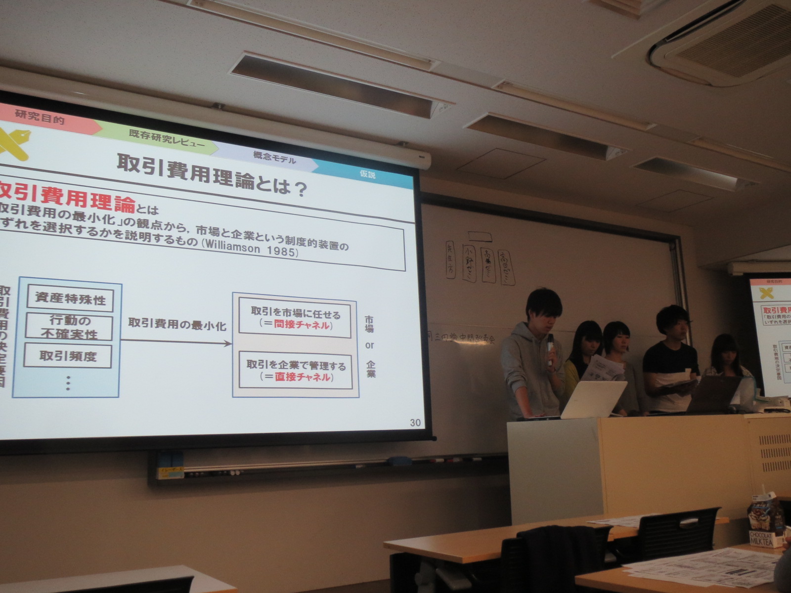 南校舎421教室にて、高橋郁夫研究会、高田英亮研究会、小野晃典研究会の3ゼミ合同三田論中間発表が行われました。 高橋郁夫研究会は、「環境配慮行動における継続行動の包括的モデルの構築――ソーシャルマーケテイングの観点から」、高田英亮研究会は、「デュアルチャネル・チャネル選択の規定要因分析」 というテーマで発表を行いました。 小野ゼミからは、久米君率いる、論文の進みに定評があるインゼミチームが代表として発表を行いました。 テーマは 「ワケあり商品の購買意図――価格効果モデルに基づいて」 でした。 どのゼミの発表内容も興味深い内容で、今後の進展が気になるものばかりでした。