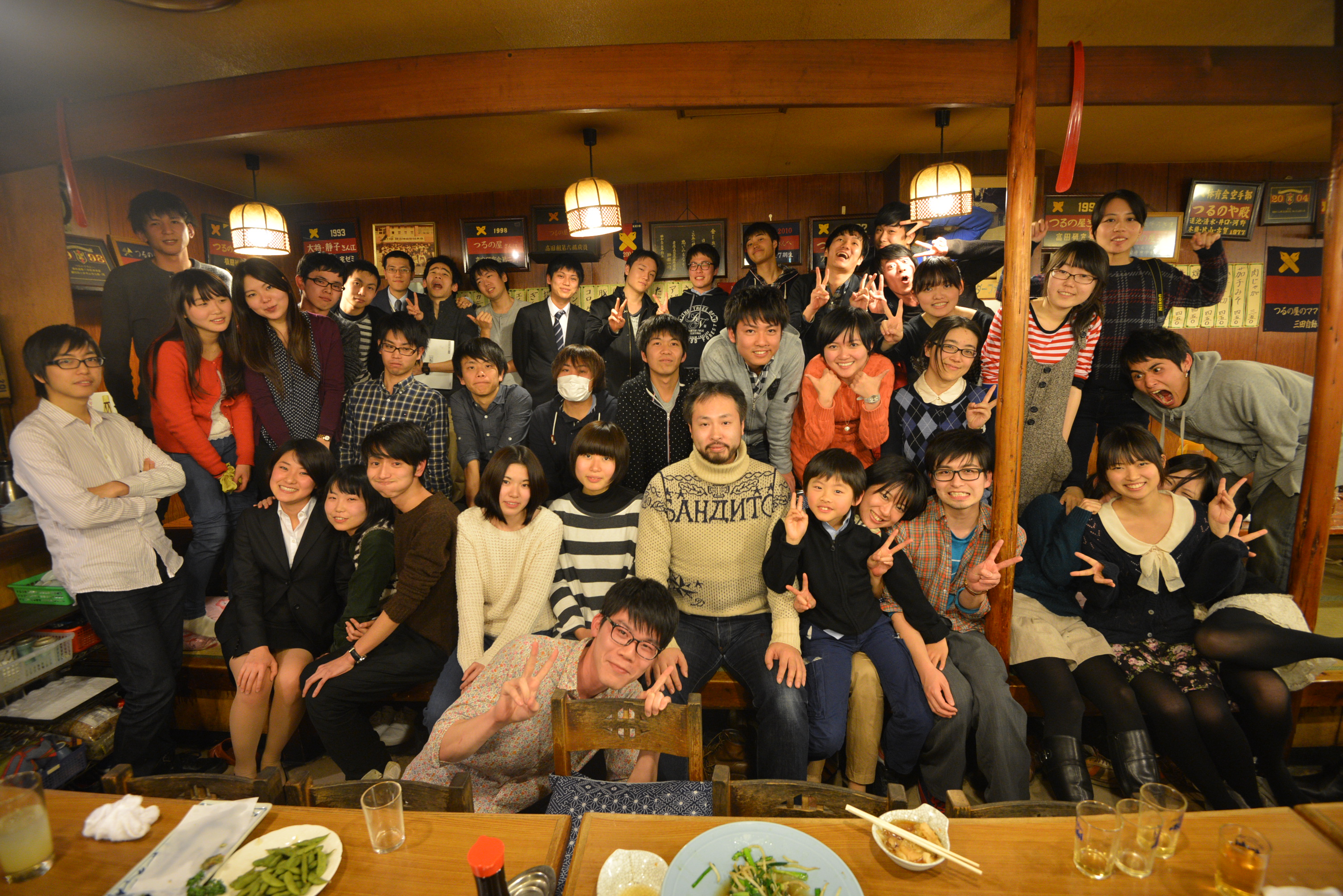 | 2013年最後の本ゼミを無事に終え、ほっと一息ついた小野ゼミ一同を待っていたのは忘年会! 忘年会とは、「年末に、その1年の苦労を忘れるために行う宴会」 (デジタル大辞泉) である。 この日はまさに、卒論提出や卒論テーマ発表に向けて戦った昨夜までの苦労を忘れるような楽しい宴会となった! 会場の 「つるのや」 には、7期OBの上田さんやふみあき君も来てくださり、いつにも増して賑やかな雰囲気であった。 上田さんが乾杯前にビールを何杯も飲みながら、何とも男らしい挨拶をしてくださった後、ゼミ長内藤君の音頭で忘年会はスタート! 各々、小野先生や先輩方に感謝の気持ちをお伝えしたり、小野先生や先輩方から労いや激励の言葉をいただいたり、卒論や就活、恋活の話題に花を咲かせたりしていた。 私は今回、人数の少ない席についたため、ここぞとばかりに食べることに精を出していた。 珍しいゲストであるふみあき君に、つるのやのおじさんから特別にメンチカツのプレゼントがあり、非常に羨ましかった! 中締めでは、第11期から小野先生へ、日ごろの感謝を込めたサプライズが! 第11期を代表して佐藤和也君がドヤ顔で先生にお酒をプレゼント! 続いて、第10期からもサプライズ! 全先さんから重大発表 (!?) があり、みんなから驚きと祝福の声があがっていた(笑)。 最後に、小野先生からお言葉をいただき、内藤君による一本締めとなった。 小野先生、2013年は大変お世話になりました。 来て下さった上田さんやふみあき君、幹事の佐藤和也君もありがとうございました。 2013年の小野ゼミの公式行事は、今日が最後であった。 今日の忘年会で2013年の苦労を忘れ、決意を新たに2013年の残り数日と2014年もゼミ活動に励もうと、心に誓って家路についたのであった。 それでは、よいお年を!(土屋) |