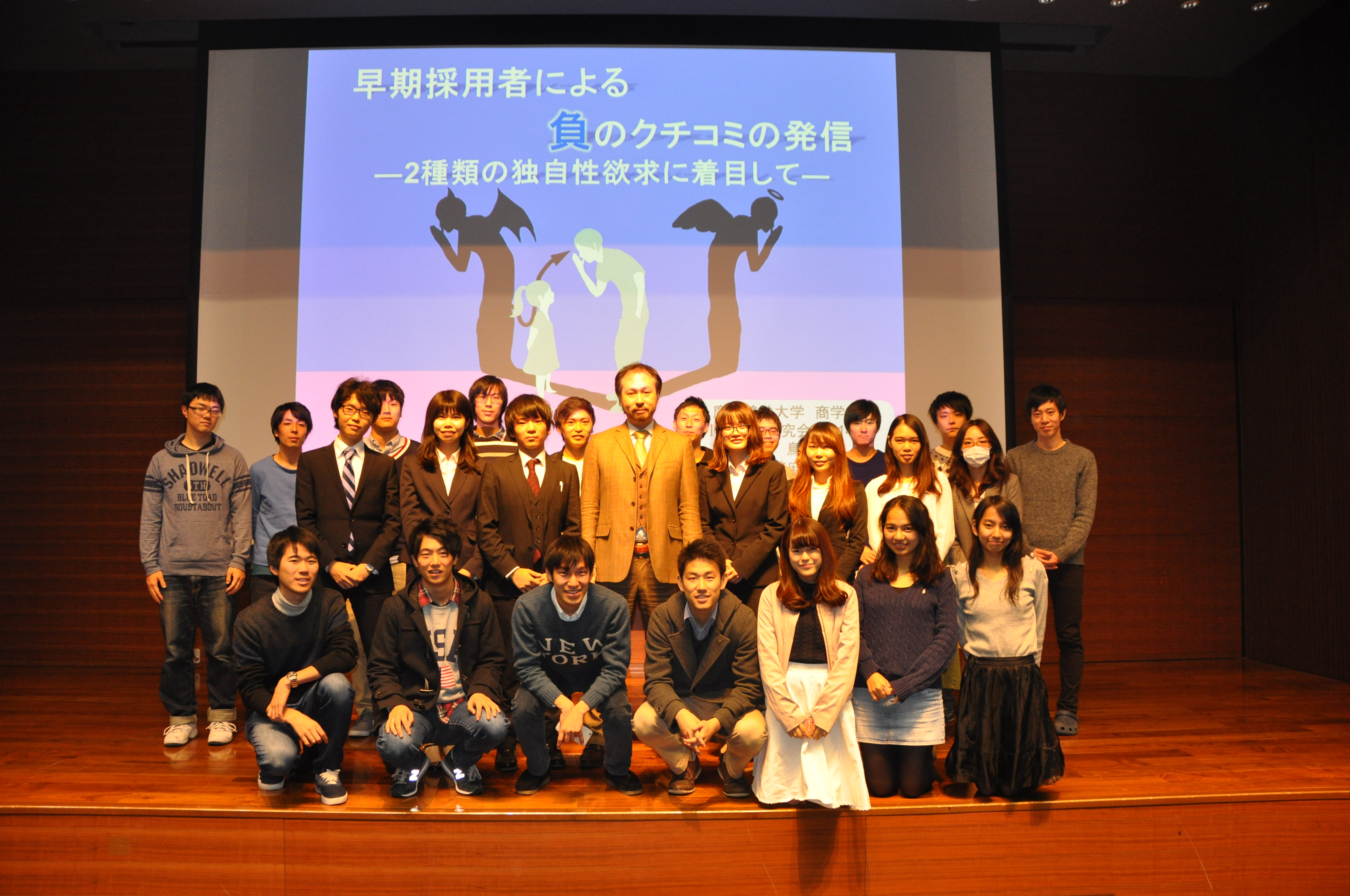| 11月17日、マーケティングゼミ合同報告会、通称マケ論が行われた。 今年も、昨年と同じように、日本語論文チームがマケ論で発表をすることになっていた。 日本語論文チームは、その半月前に関マケ(関東学生マーケティング大会)への論文の提出を終え、マケ論のプレゼンへ用意周到にして臨むはずであった。 しかし、そうはいかなかった。 論文の加筆や修正作業に、三田祭のブースで展示するパネルの作成、関マケに向けた実務的示唆についての話し合い、そして、マケ論のパワポの推敲…。 思っていた以上にしなければならないことが多く、マケ論の発表原稿が完成したのは、前日の夜であった。 当日の朝9時に、公園に集合し、全員で合わせ練習を行うはずだった。 またしても予定通りにいかなかった。 寝坊や電車の遅延による遅刻、役職の仕事などなど、様々な理由があり、結局合わせて練習できたのはたったの2回だった。 最後の1回は、ありがたいことに、たまたま鉢合わせた第13期の小黒さんに見ていただき、フィードバックを頂いた。 励ましのお言葉をいただき、みんなの不安が少し和らいだようだった。 小野ゼミは、トップバッターで発表をした。 多くの人の目線を感じ、緊張しながら臨んだ発表は、大きな失敗もなく終えることができた。 先輩方や同期のみんなから、「今までで一番分かりやすかったよ。」と言われ、非常にうれしかった。 聞きに来てくださった方々、応援に来てくださった先輩方や同期のみんな、そして、マケ論に向けて何度もご指導してくださった小野先生、誠にありがとうございました。 日本語論文チームの活動は、マケ論が最後ではない。 11月26日には関マケが控えている。 活動最終日に向け、チーム全員で力を合わせて頑張っていこう! (吉永) |