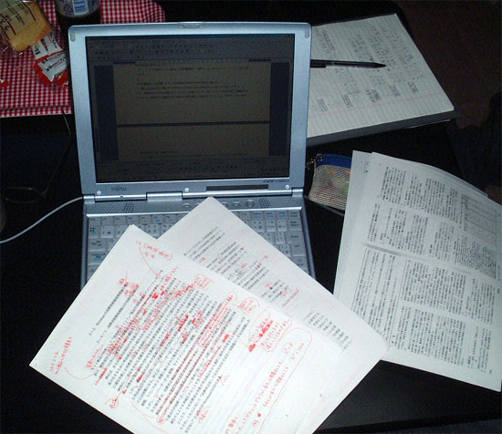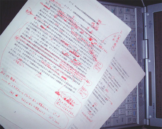 この真っ赤な原稿は!? そう、小野先生の直しチェックが入った原稿です。 こんな感じで何度も何度も、小野先生から真っ赤な原稿を突き返されて・・。 少しづつ、まともな文章を書けるようになりました・・。