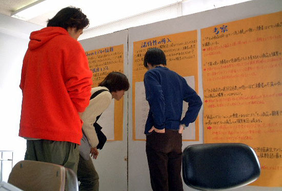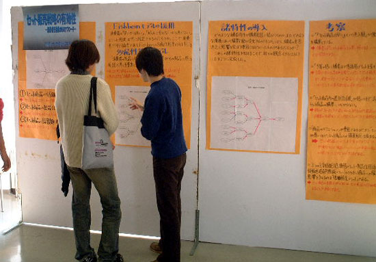 ブースでの説明の様子。 三田祭論文担当者を中心にみんなで、2年生などの熱心な訪問者に研究説明を行いました。 「今日の昼食はファーストフード?セットメニューだった?」 というところから、話を展開中!