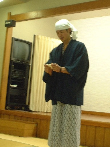 | 朝食後、退会挨拶を行う西村君。彼は大学4年で早くも就職。 両立不能なため、この合宿をもって、ゼミを退会していきました。 |