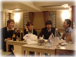 | 思えば私達3期生が小野晃典研究会に入って一年間、先生はもちろん、2期生の先輩がいなければ今日の自分達はいないだろうと確信を持って言えるほどにお世話になりました。 先輩に怒られたり褒められたり、そしてアドバイスをいただいたりする中で、常に自分達の未熟さと先輩方の1つ上を行く視点に驚いてきた1年間だったと思います。 しかしそんな日々も今日で本当に終わりかと思うとなかなかに別れを切り出せず、話は尽きぬままに園遊会の夜は更けていくのでした。(田中) |