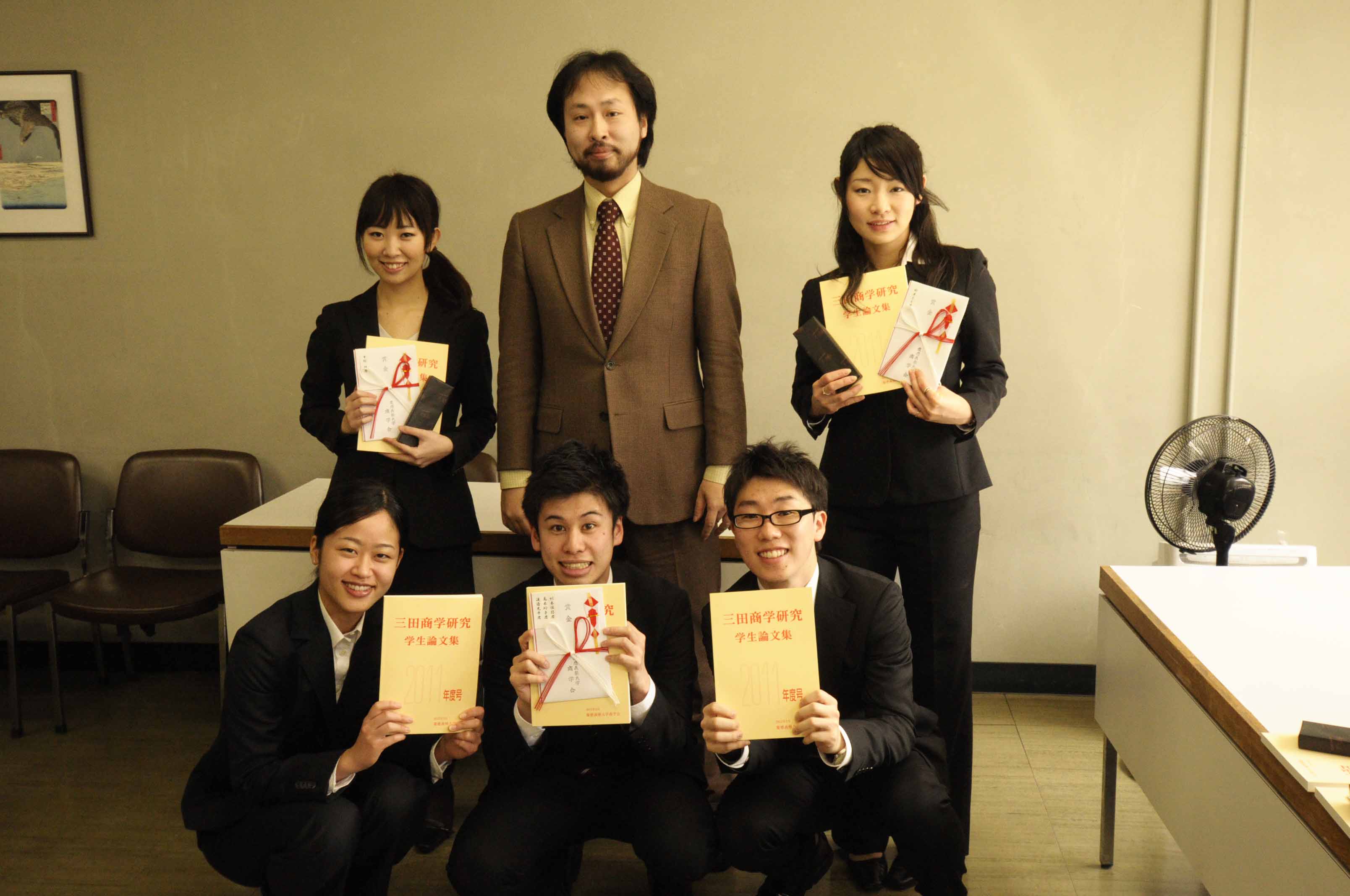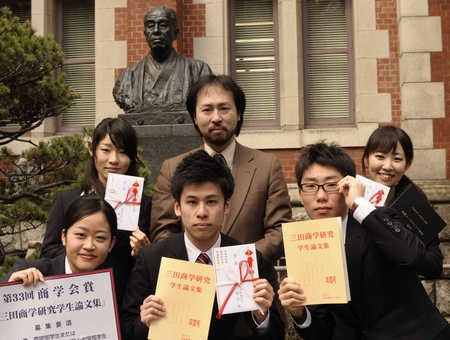 商学会賞を狙いはじめてから約10ヶ月後の3月26日、ついに授賞式を迎えた私たち。 本日も晴天なり。 今回、この栄誉ある賞を受賞した学生11組のうち、第8期の中村さん、鈴木さん、そして、第9期の私たち 「十ゼミチーム」(刎本・高木・渡邉) の3組の小野ゼミ生が占めることができました。 |