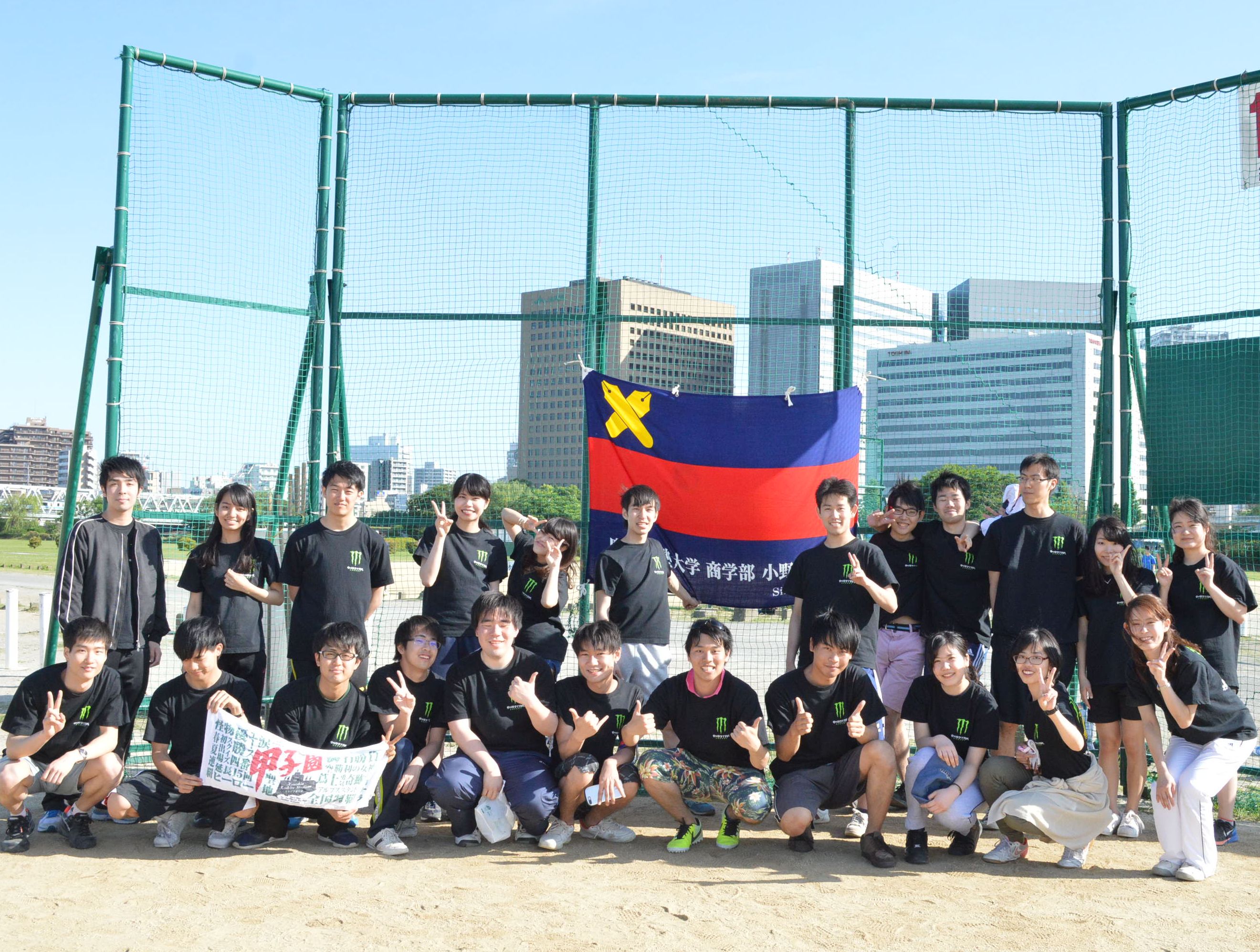 | 本日のサブゼミは待ちにまったソフトボール大会! この日のために、前回の本ゼミの時間を練習に充て、団結力、そしてスキルを磨いてきた。 この日は天候にも恵まれ、澄み渡るような青空が広がった。 日頃グル学で絆を温めている第15期はもちろん、第14期の先輩方、さらに院生の川村さんまで駆けつけてくださり、モンスターをあしらったゼミTシャツを身に纏い、小野ゼミ全体で一致団結した大会であった。 その象徴として、第15期の合場君を筆頭に、攻撃時だけでなく、守備においても小野ゼミ生全員で声援を送っていた。 第1試合の対戦相手は八代ゼミ。 先発ピッチャーは合場君。 しかし、制球“も”定まらず1人目の打者でフォアボールを出し降板。 第15期のミスをカバーしたいところであったが、内野陣にミスが散見し、この回3失点。 その後、一時は3点差を追いついた小野ゼミであったが、あと一歩のところで踏ん張れず、サヨナラ負けを喫した。 第2試合は、井口ゼミとの試合。 先発ピッチャーは第1試合で好投した手束君。 1回の表の守備は、なんと三者三振で井口ゼミをシャットアウト。 いい流れで、試合を運んだ小野ゼミではあったが、井口ゼミの助っ人女子に苦しみ、最終回となる4回裏を3点のビハインドで迎えた。 絶体絶命のピンチ、最初の打者は、ここまで見事な投球を見せてくれていた手束君。 熱い思いでバッターボックスに立ったものの、打球は力なく空を舞い内野フライに終わる。 ワンアウトで打席に立ったのは福田君。 ここで男を見せた福田君は、執念のバッティングで見事に出塁を果たす。 続いてバッターボックスに立ったのは、ここまで小野ゼミ全体を応援で引っ張ってきた合場君。 彼の勢いは口だけかと思いきや、鋭い打球は、女性外野手の横をすり抜け、スリーベースヒット。 小賢しいバッティングで1点を返すと、小野ゼミの窮地を救った。 経験者の意地を見せスリーベースヒットで同点。いよいよ勝利まであと1歩。 泥臭くバットに当てたボールは、相手投手のフィルダーズチョイスを誘う。 チームで掴んだサヨナラ勝利に小野ゼミ全員は歓喜の渦に包まれた。 結果としては、同ブロック内の全てのチームが同勝利数、同得失点差となり、総得点数により小野ゼミは決勝リーグに進むことができませんでした。 しかしながら、勝利を目指して突き進むことで、小野ゼミの団結力はさらに高まったに違いありません。 普段はグループ学習室で活躍する小野ゼミ生が、六郷土手で輝いた1日でした。 (野口) |