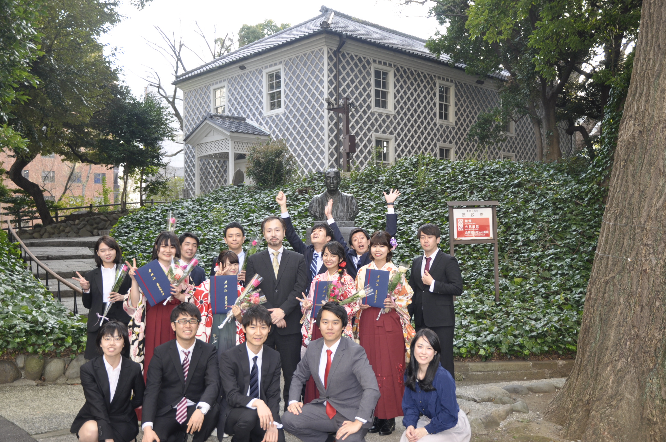 最後の最後まで迷惑をかけてしまい、大慌てで待ち合わせ場所の演説館前に向かうと、大学院生さん全員と15期生の姿が。 正直な話、こんなにも多くの方々が集まってくれているとは思わなかったため、図らずも感動。 全員が揃うと15期生はお花を、大学院生さんは花束とお菓子をくださったため、さらに感動…。 大学院生さんなんて、「ええ?わざわざスーツ着て三田に行くの?…」などと仰っていたのに…。 私たちのこと、大好きだなぁ?、私たちも大好きですけど?。 15期の皆も、就活で忙しい中わざわざ三田まで来て、お祝いをしてくれてありがとう! とっても嬉しかったです。 小野先生、先輩方、同期、そして後輩と写真を撮り、グループ学習室へ向かうと、ああ、これも最後のグル学から見る東京タワーかあ、などと物悲しくなりました。 しかし私たちには、仕事や人生に悩んだ時、いつでも温かく出迎えてくれるゼミがあります。 小野先生、何度も大変なご迷惑をおかけしたにも関わらず、最後まで私たちを見捨てずに、温かく見守ってくださり、本当に、本当にありがとうございました。 小野ゼミでは楽しいことや辛いことをたくさん経験し、それらを通して、学業においても、人間関係においても、多くのことを学びました。 「アマチュア」の大学生では経験し得ないことを経験した私たちにしかできないことを、たくさん成し遂げられるような社会人になります。 2年間のゼミ生活を終えた今、ようやく胸を張って大きな声で、「ゼミです!」と言うことができます。 (江黒) |