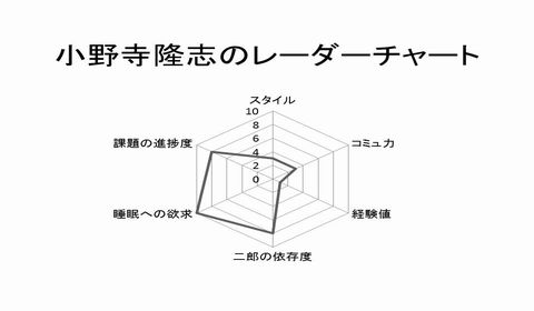 | スタイル: コミュ力: 経験値: 二郎の依存度: 睡眠への欲求: 課題の進捗度: |